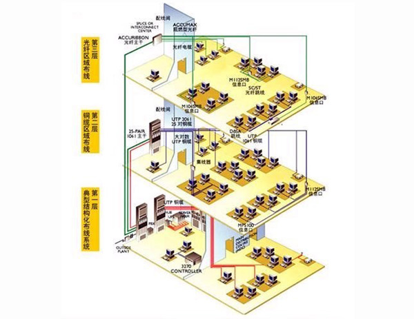 1、工作区子系统 工作区子系统是指从水平系统用户信息插座延伸至数据终端设备的区域,由连接线缆和适配器组成。工作区的UTP/FTP跳线为软线(Patch Cable)材料,即双绞线的芯线为多股细铜丝,最大长度不能超过5M。2、水平子系统 水平子系统指从楼层配线间至工作区用户信息插座。由用户信息插座、水平电缆、配线设备等组成。综合布线中水平子系统是计算机网络信息传输的重要组成部分。采用星型拓扑结构,每个信息点均需连接到管理子系统。由UTP、STP线缆构成。最大水平距离:90m(295ft)。指从管理间子系统中的 配线架的JACK端口至工作区的信息插座的电缆长度。工作区的patch cord、连接设备的patch cord、cross-connection线的总长度不能超过10m。水平布线系统施工是综合布线系统中最大量的工作,在建筑物施工完成后,不易变更。因此要施工严格, 保证链路性能。综合布线的水平线缆可采用超五类、六类双绞线、也可采用屏蔽双绞线,甚至可以光纤到桌面。3、管理子系统 在综合布线六个系统中对管理子系统的理解定义上各标准、厂商有所差异,单单从布线的角度上看,称之为楼层配线间或电信间是合理的,而且也形象化;但从综合布线系统最终应用--数据、语音网络的角度去理解,称之为管理子系统更合理。它是综合布线系统区别与传统布线系统的一个重要方面,更是综合布线系统灵活性、可管理性的集中体现。因此在康宁综合布线系统中称之为管理子系统。管理子系统设置在楼层配线房间、是水平系统电缆端接的场所,也是主干系统电缆端接的场所;由大楼主配线架、楼层分配线架、跳线、转换插座等组成。用户可以在管理子系统中更改、增加、交接、扩展线缆。用于改变线缆路由。建议采用合适的线缆路由和调整件组成管理子系统。管理子系统提供了与其他子系统连接的手段,使整个布线系统与其连接的设备和器件构成一个有机的整体。调整管理子系统的交接则可安排或重新安排线路路由、因而传输线路能够延伸到建筑物内部各个工作区。是综合布线系统灵活性的集中体现。 管理子系统三种应用:水平/干线连接;主干线系统互相连接;入楼设备的连接。线路的色标标记管理可在管理子系统中实现。4、垂直干线子系统 垂直干线子系统由连接主设备间至各楼层配线间之间的线缆构成。其功能主要是把各分层配线架与主配线架相连。用主干电缆提供楼层之间通信的通道,使整个布线系统组成一个有机的整体。垂直干线子系统拓扑结构采用分层星型结构,每个楼层配线间均需采用垂直主干线缆连接到大楼主设备间。垂直主干采用25对大对数线缆时,每条25对大对数线缆对于某个楼层而言是不可再分的单位。垂直主干线缆和水平系统线缆之间的连接需要通过楼层管理间的跳线来实现。垂直主干线缆安装原则:从大楼主设备间主配线架上至楼层分配线间各个管理分配线架的铜线缆安装路径要避开高EMI电磁干扰源区域(如马达、变压器),并符合ANSI TIA/EIA-569安装规定。电缆安装性能原则:保证整个使用周期中电缆设施的初始性能和连续性能。大楼垂直主干线缆长度小于90M时,建议按设计等级标准来计算主干电缆数量;但每个楼层至少配置一条超五类或六类线做主干。大楼垂直主干线缆长度大于90M,则每个楼层配线间至少配置一条室内或多用途四芯多模光纤做主干。主配线架在现场中心附近、保持路由最短原则。5、设备间子系统 设备间子系统是一个集中化设备区,连接系统公共设备,如PBX、局域网(LAN)、主机、建筑自动化和保安系统,及通过垂直干线子系统连接至管理子系统。设备间子系统是大楼中数据、语音垂直主干线缆终接的场所;也是建筑群来的线缆进入建筑物终接的场所;更是各种数据语音主机设备及保护设施的安装场所。建议设备间子系统设在建筑物中部或在建筑物的一、二层,位置不应远离电梯,而且为以后的扩展留有余地,不建议在顶层或地下室。建议建筑群来的线缆进入建筑物时应有相应的过流、过压保护设施。 设备间子系统空间要按ANSI/TIA/EIA-569要求设计。设备间子系统空间用于安装电信设备、连接硬件、接头套管等。为接地和连接设施、保护装置提供控制环境;是系统进行管理、控制、维护的场所。设备间子系统所在的空间还有对门窗、天花板、电源、照明、接地的要求。6、建筑群子系统 当学校、部队、政府机关、大院的建筑物之间有语音、数据、图象等相联的需要时,由二个及以上建筑物的数据、电话、视频系统电缆组成建筑群子系统。包括大楼设备间子系统配线设备、室外线缆等。可能的路由:架空电缆、直埋电缆、地下管道穿电缆。建筑群子系统介质选择原则: 楼和楼之间在二公里以内、传输介质为室外光纤、可采用埋入地下或架空(4M以上)方式、需要避开动力线、注意光纤弯曲半径。建筑群子系统施工要点:包括路由起点、终点;线缆长度、入口位置、媒介类型、所需劳动费用以及材料成本计算。建筑群子系统所在的空间还有对门窗、天花板、电源、照明、接地的要求。